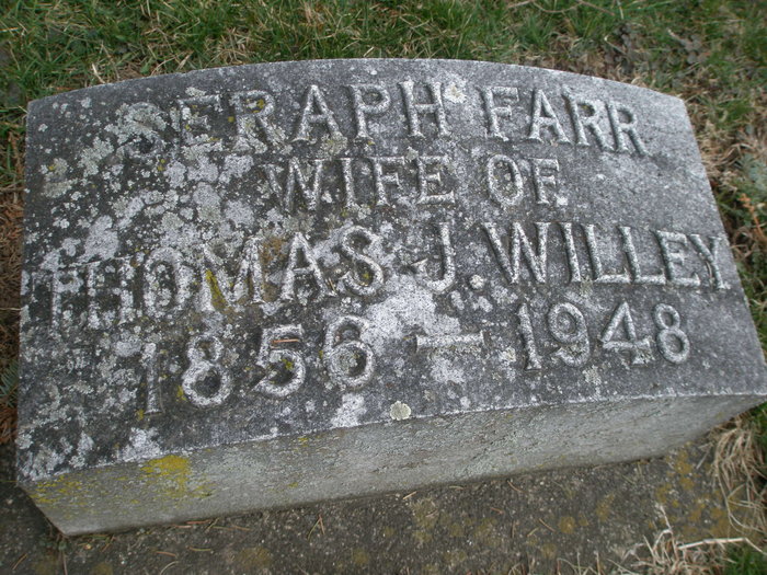 Seraph Saphronia FARR [Parents] [scrapbook] was born 1, 2 on 24 Feb 1856 in Cottage Grove, Dane, Wisconsin, United States. She died 3 on 24 Jun 1948 in Lake Mills, Jefferson, Wisconsin, United States. Seraph married Thomas Jefferson WILLEY in 1879 in Lake Mills, Jefferson, Wisconsin, United States.