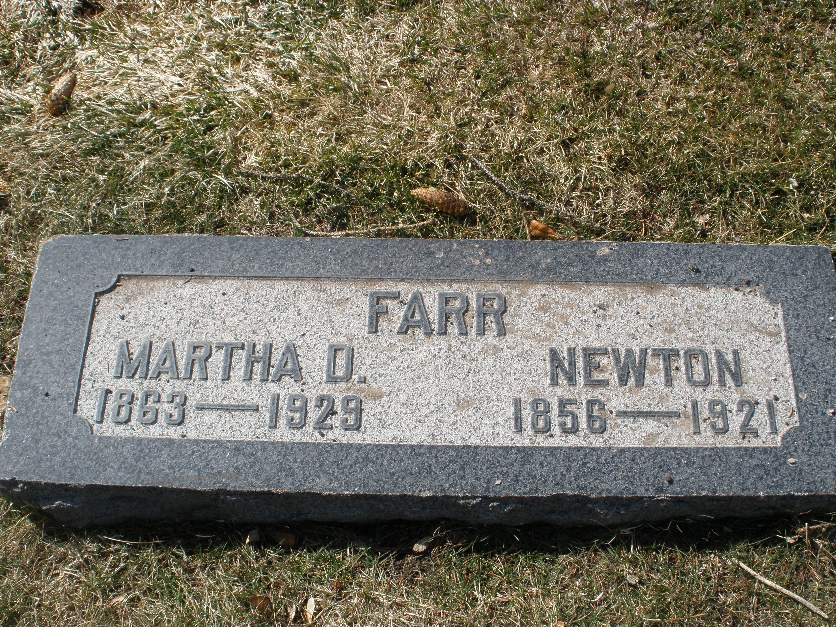 Newton FARR [Parents] [scrapbook] was born 1, 2, 3 on 31 May 1856 in Ogden, Weber, Utah, United States. He died 4 on 16 Jun 1921 in Salt Lake City, Salt Lake, Utah, United States. He was buried 5 on 18 Jun 1921 in Salt Lake City, Salt Lake, Utah, United States. Newton married 6 Martha DAVIS on 19 Oct 1882 in Salt Lake City, Salt Lake, Utah, United States.