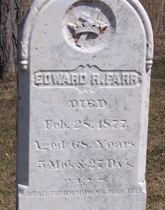 The 1870 census, taken in August of that year, shows Uriah Farr as a resident of Beatrice, Gage Co., NE, along with his son, William. Huldah and daughter Lucia (now married to Millard Fillmore) remain in McHenry Co., IL. The separation of Huldah and Uriah might suggest marital problems, but I have seen other examples (e.g., Winsor E. Lott and Katie Case -- not linked to the Farr line until my own generation) where the husband moved to the frontier ahead of his wife to settle affairs and determine whether the family should indeed settle there. That Uri may have been scouting out NE for his family is suggested by his September 10, 1870 declaration for pension, which gives McHenry Co., IL as his residence; and by the fact that Huldah is found with him in Nebraska in the 1880 census.