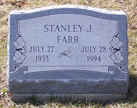 Stanley FARR [Parents] [scrapbook] 1 was born 2, 3 on 27 Jul 1933 in Potsdam, St. Lawrence, New York, United States. He died 4, 5 on 28 Jul 1994 in Cape Vincent, Jefferson, New York, United States. Stanley married Lottie BIGDA on 10 Nov 1962 in St Vincent de Paul Church, Jefferson, New York, United States.