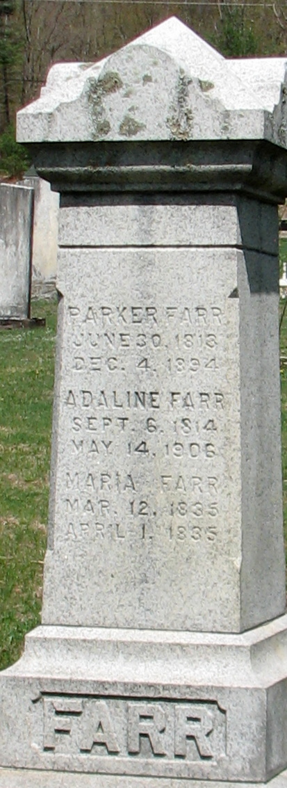 Parker FARR [Parents] [scrapbook] was born 1 on 30 Jun 1813 in Chesterfield, Cheshire, New Hampshire, United States. He died 2, 3 on 4 Dec 1894 in Chesterfield, Cheshire, New Hampshire, United States from of old age. He was buried 4 in Chesterfield, Cheshire, New Hampshire, United States. Parker married 5, 6, 7 Adeline DAVENPORT on 28 Sep 1834 in Dummerston, Windham, Vermont, United States.