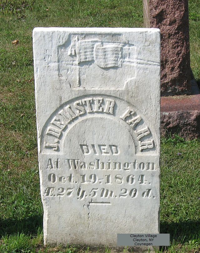 John Dempster FARR [Parents] [scrapbook] 1 was born on 30 Apr 1837 in Hounsfield Township, Jefferson, New York, United States. He died on 19 Oct 1864 in Washington, District of Columbia, United States. John married Frances Ann DAVIS 2 in 1858 in Jefferson, New York, United States.
