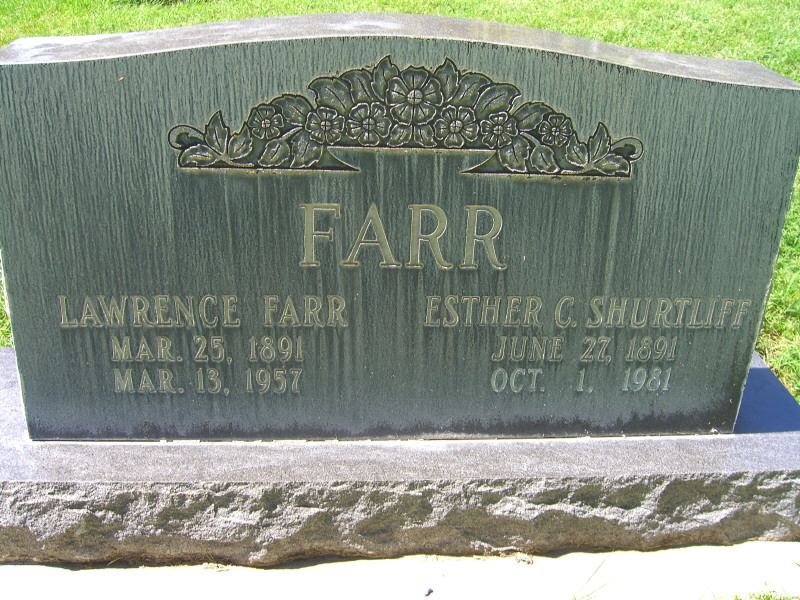 Lawrence FARR [Parents] [scrapbook] was born 1 on 25 Mar 1891 in Ogden, Weber, Utah, United States. He died 2 on 13 Mar 1957 in Ogden, Weber, Utah, United States. Lawrence married 3 Esther Catherine SHURTLIFF on 27 Jun 1918 in Salt Lake City, Salt Lake, Utah, United States. |