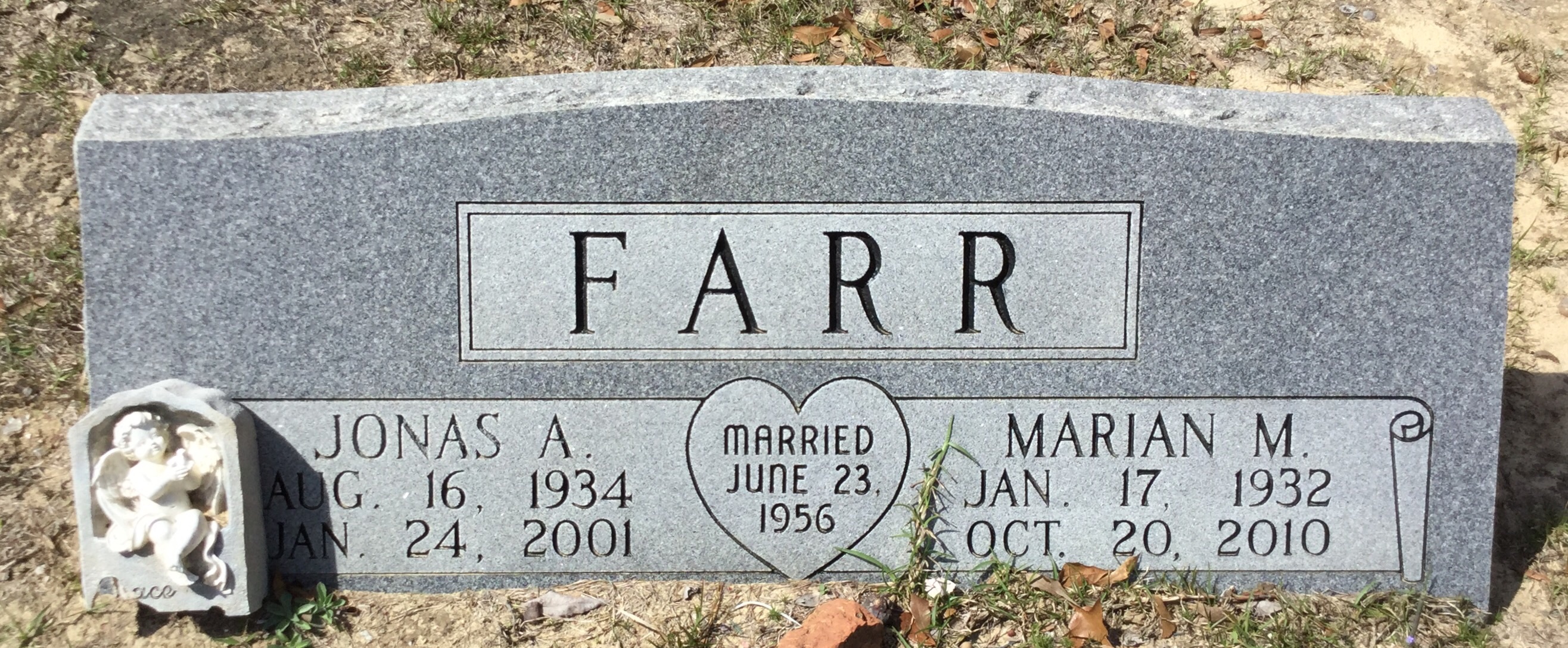 Jonas A FARR [Parents] [scrapbook] was born 1 on 16 Aug 1934 in Allendale, Allendale, South Carolina, United States. He died 1 on 17 Jan 2001 in Walterboro, Colleton, South Carolina, United States. Jonas married 2 Frances Marian MORRIS on 23 Jun 1956 in Allendale, South Carolina, United States.