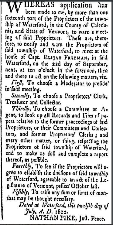 | Capt. Elijah Freeman Prprietor's Mtg. Date: Wednesday, August 11, 1802 Paper: Green Mountain Patriot (Peacham, Vermont) Volume: V Issue: 234 Page: 4 |