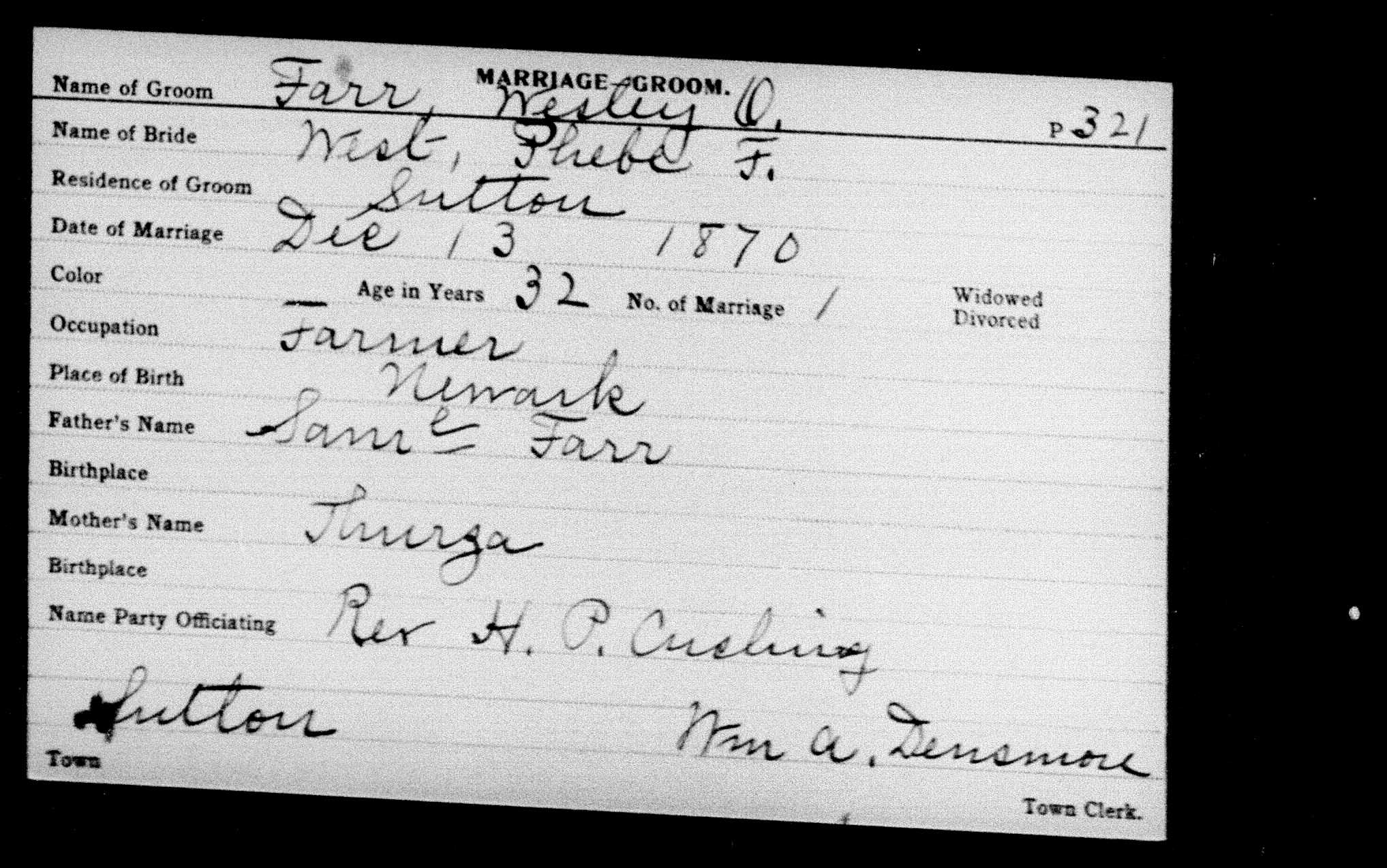 Wesley O Farr and Phebe West Marriage Record