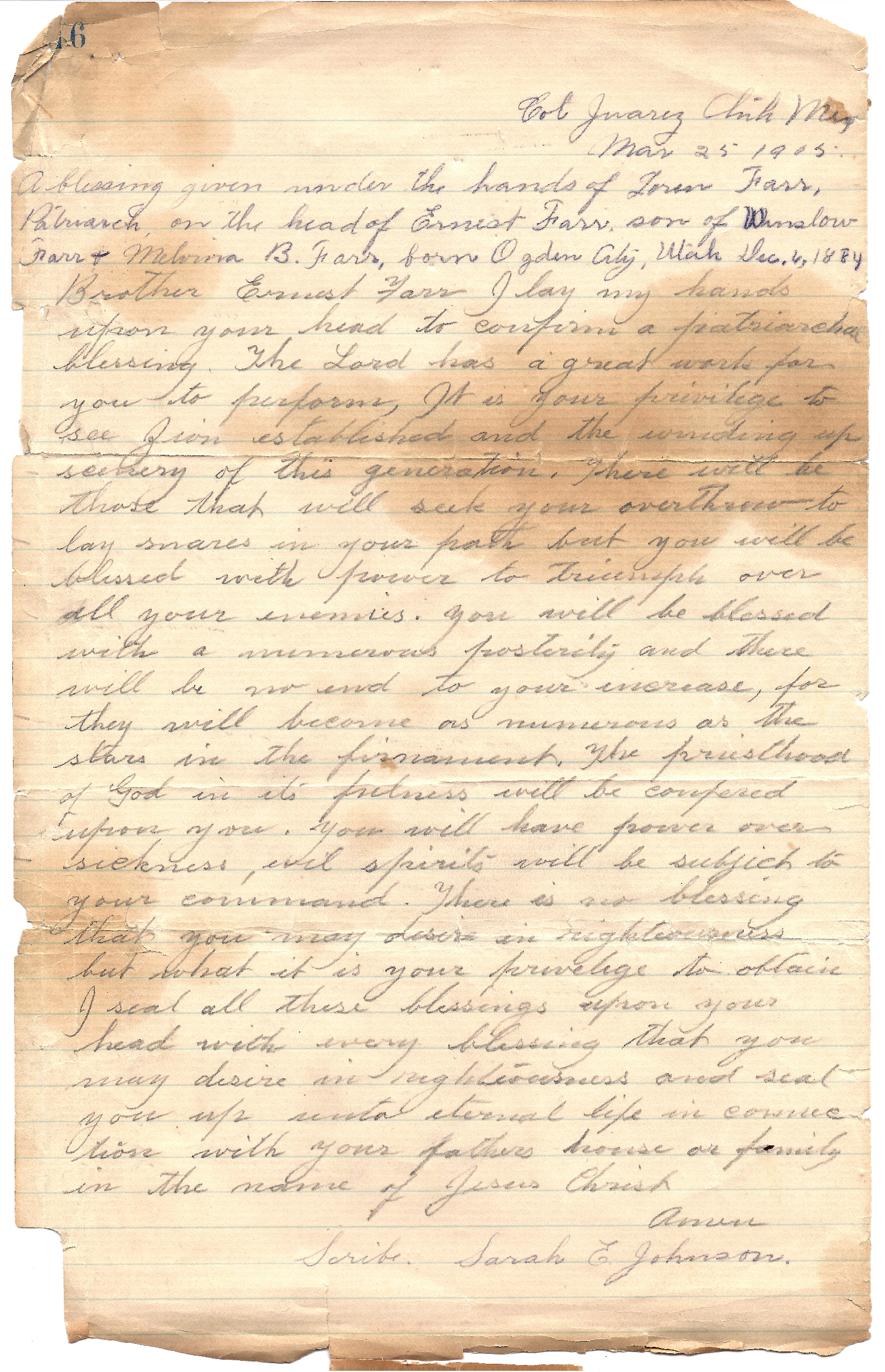 Ernest Farr Patriarchal Blessing Given by Lorin Farr in Jaurez, Mexico