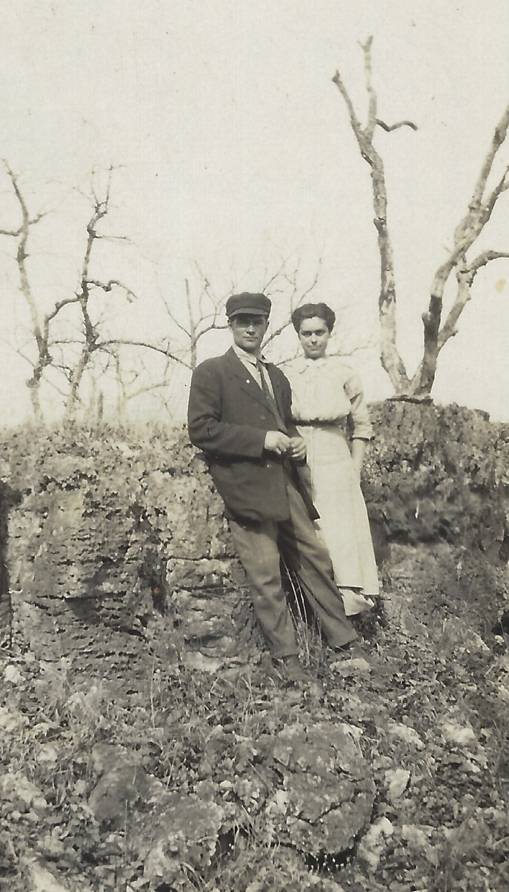 This photo was taken in 1912 in Mountain View, Missouri. The couple lower on the rocks is Frank and Vila Farr and the family higher on the rocks is Leland Roy Fillman his wife Malinda Sparks Fillman and their daughter Catherine Louise Fillman.