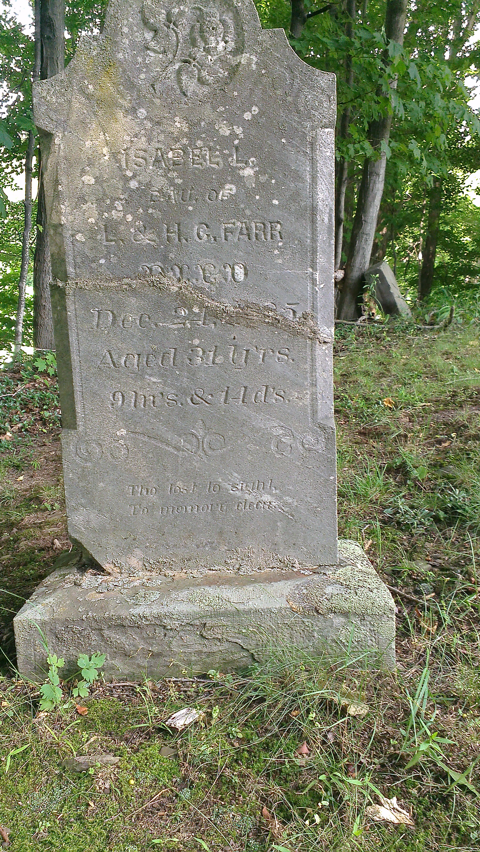 Isabel L FARR [scrapbook] was born 1 on 10 May 1854 in Forkston, Wyoming, Pennsylvania, United States. She died 2 on 24 Dec 1885 in Pennsylvania, United States. She was buried 3 in 1885 in Forkston, Wyoming, Pennsylvania, United States.
