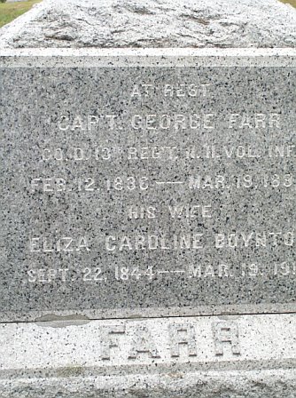 As soon as his wound permitted he returned to the field, and September 9, 1862. was promoted to rank of major in the New Hampshire Eleventh. After fighting with distinguished gallantry at Fredericksburgh, Major FARR went with his regiment to the West, and participated in the siege and capture of Vicksburgh. After the capture he went South with General Sherman to attack General Johnston at Jackson, Mississippi, and during the remainder of the war served on court-martial duty, most of the time as judge-advocate.