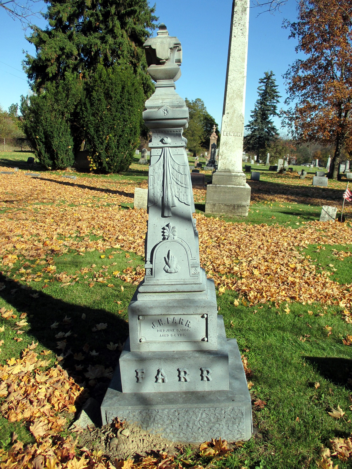 She was married to Julius E. Farr, Dec. 22nd, 1860. To this union was born nine children, two daughters and seven sons, of whom all are living. The children are Mrs. H. S. Earl of Galesburg, MI; Mrs. E. J. Sheldon, Woodland, MI; Eugene, Justin, Frank, Irwin, Jesse, Fred and George Farr, all of California. There are 37 grandchildren and 14 great-grandchildren. She is also survived by two sisters, Mrs. H. S. Sleeper, of Pasadena, CA, and Mrs. E. W. Sleeper of Galesburg, MI, and a host of nieces and nephews.