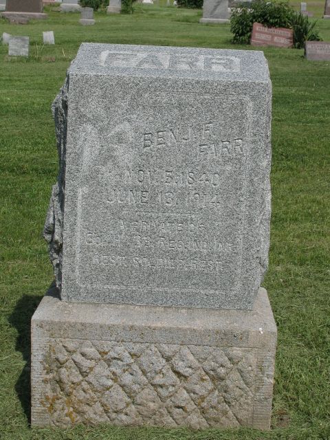 James and Catherine Farr saw ten of their young men march off to the great War to Save the Nation: son Nathan; grandsons Nathan L., Uriah H., James B., Thomas J., Jefferson C., William L., Benjamin F., and Harvey J. Laughlin; grand son-in-law, Absalom Ross. Of these: two became prisoners of war and were released in exchange; four were wounded in action. All survived the War. (Information provided by Joseph Burkhart, taken from a family history document that was compiled by Dr. James Farr, great great grandson of James and Catherine Farr.)