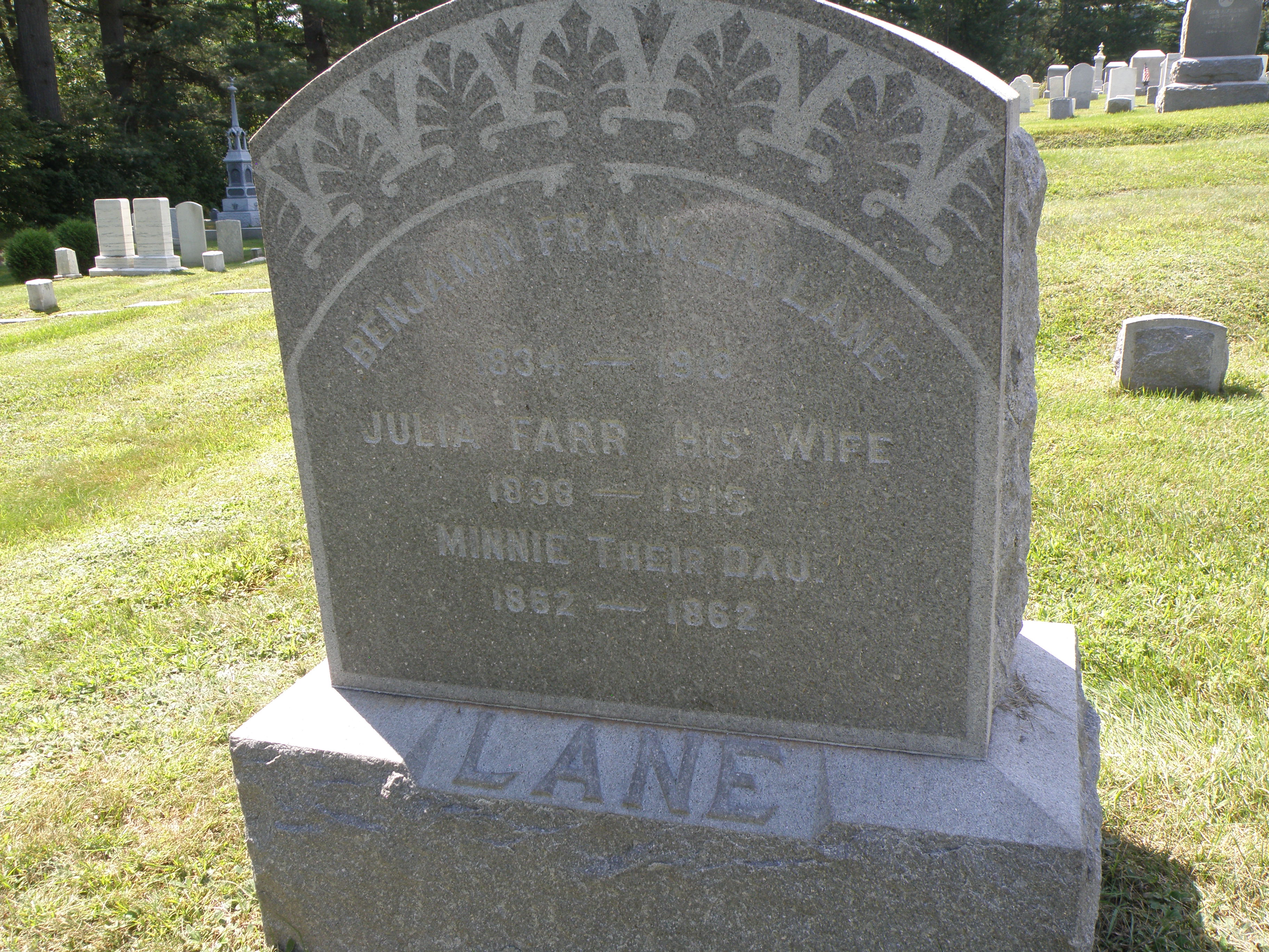Julia Ann FARR [Parents] [scrapbook] was born 1, 2 on 28 Apr 1838 in Littleton, Grafton, New Hampshire, United States. She died 2 on 4 Jan 1915 in Concord, Merrimack, New Hampshire, United States. She was buried 2, 3 in Jan 1915 in Whitefield, Coos, New Hampshire, United States. Julia married 1, 4, 5 Benjamin Franklin LANE on 20 Mar 1861 in Littleton, Grafton, New Hampshire, United States. |