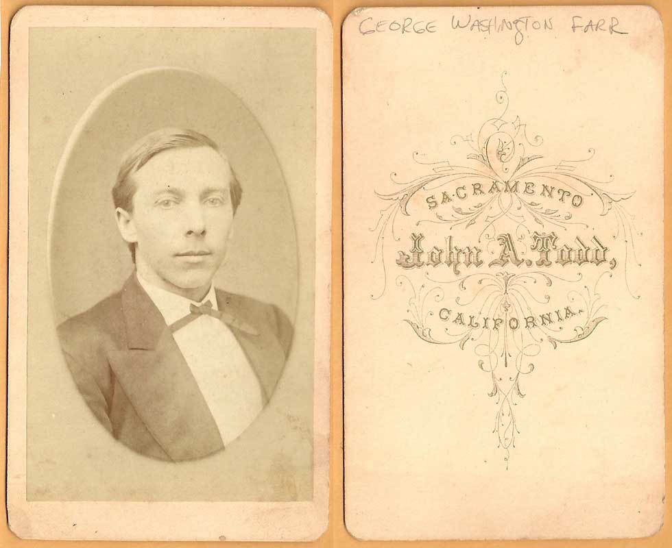 George W. FARR [Parents] [scrapbook] was born 1, 2 on 18 Sep 1846 in Littleton, Grafton, New Hampshire, United States. He died 1, 2 on 26 Aug 1881 in Sacramento, Sacramento, California, United States. George married 1, 3 Lizzie A. DEAL on 6 Jan 1874 in Sacramento, California, United States.