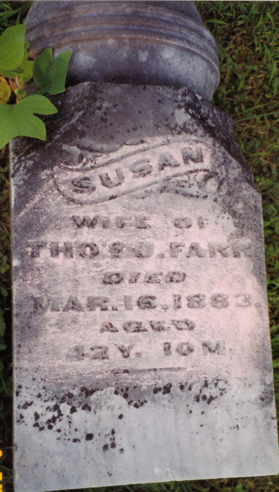 Susan GOBLE [scrapbook] 1, 2 was born on 29 May 1840 in Morgan, Indiana, United States. She died 3 on 16 Mar 1883 in Indiana, United States. She was buried in 1883 in Union Cemetery, Paragon, Morgan, Indiana, United States. Susan married 4, 5 Thomas Jefferson FARR 1, 6, 7 on 19 Mar 1866 in Morgan, Indiana, United States. |