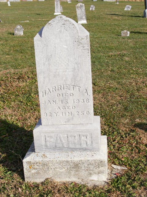 Harriot A. EATON [scrapbook] 1 was born 2 on 21 Jan 1845 in Gosport, Owen, Indiana, United States. She died 3 on 15 Jan 1938 in Missouri, United States. Harriot married 4 Dr. Jefferson Coleman FARR "Little Doc" 1, 5, 6 on 14 Jan 1864 in Spencer, Owen, Indiana, United States.