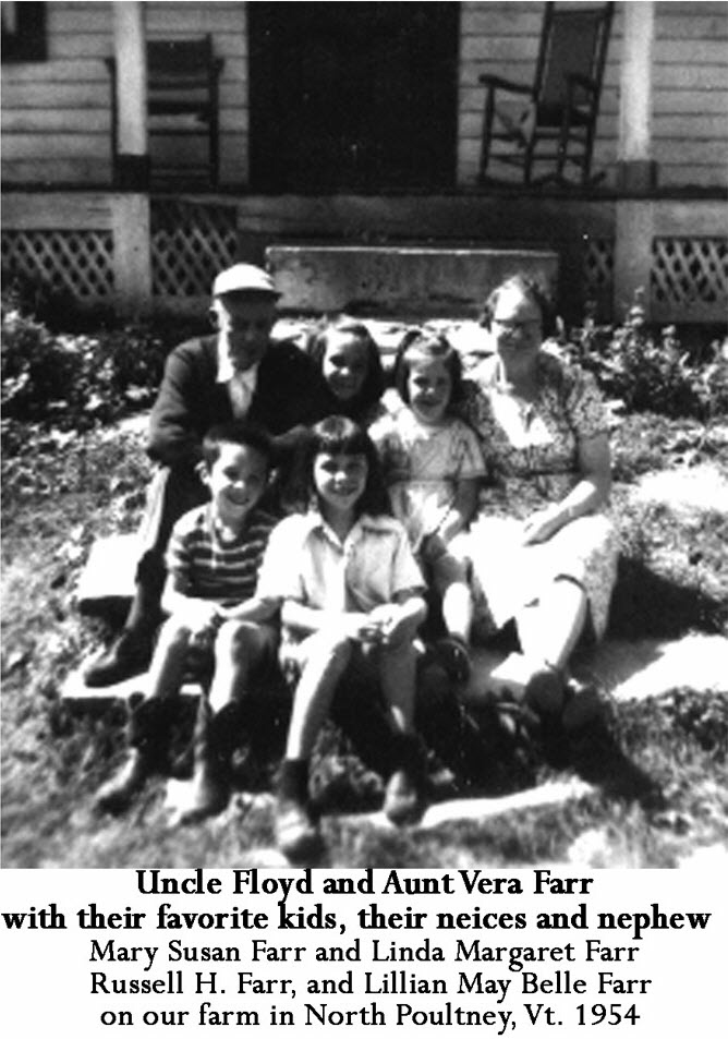 Memories of Linda M. Welch: "Sadly, none of the four Farr grandkids got to know our grandfather Farr. He died of a heart attack five years before I was born. My father had told me stories of grandfather Leon and my mother often told me that he spoiled my father and neglected to teach him the proper sense of responsibility! I agree that my father must have been spoiled, but he was a delight and we all loved him so. Grandma Farr was a very self sufficient and proud woman. She was a nurse and worked for a living and had her own circle of friends and involvement in Pepperell where she lived. We used to visit her in Pepperell and I always remember what a beautiful colonial town it was. Now I have learned much about its historical past and it holds an even more special place in my memory. Grandma was the President of the Golden Age Society of Pepperell and was responsible for organizing activities for the senior citizens there. Her sister was my Aunt Lillian. Aunt Lill was a character and had dyed red hair and wore tons of makeup and colorful jewelry- and she was in her 80s! After her husband John Rodier died, she had many suitors and boyfriends. They used to come up to the farm in the Fall time of the year to visit and it seemed she always had a different "friend" with her each time she came. Gram Farr paid us many visits and at one time had her own room in our farmhouse I cannot remember the particulars, but know we- the four Farr kids, were all very happy to have her living with us. She left when and went back to work in nursing, and when she came to visit, she would always take the bus to Rutland and spend the night at the Bardwell House before Daddy drove down to pick her up and bring her up to the farm. She always dressed with great care and had a wonderful figure. She was a special lady- I think much of her character came from her "English" background. Her mother, Mary Ellen Baker was the daughter of two English immigrants to America- Robert Baker and Maria Burkinshaw. The Burkinshaw Family, Maria's parents, were from Sheffield, England and came to Pepperell, Massachusetts where they opened a knife factory and were quite prosperous. Mr. Baker also came from Sheffield England, to work in the Burkinshaw Knife Factory and it was here he met and married Maria. Their daughter, Mary Ellen Baker married Henry Edgar Frost from Norway, Maine, who was my great-grandfather. My grandmother Farr was born in Sommerville, Massachusetts while her father was working as a Supervisor at the McLean Hospital- so she was introduced to the nursing profession at a very early age. Grandma must have been devastated when her husband Leon died in 1944. Her son Russell- my dad, was in military service at the time and was not able to come home for the funeral. She made do with her life and went on with it- often times traveling to California to visit her daughter and granddaughter and great-grandchildren there. She worked hard and was able to retire with a little pension. She took up painting for a hobby and loved to paint Vermont scenes- especially foliage scenes. I have a few of her oil paintings, and my sister Mary has a few also. I was in California when she died and not able to attend her funeral."