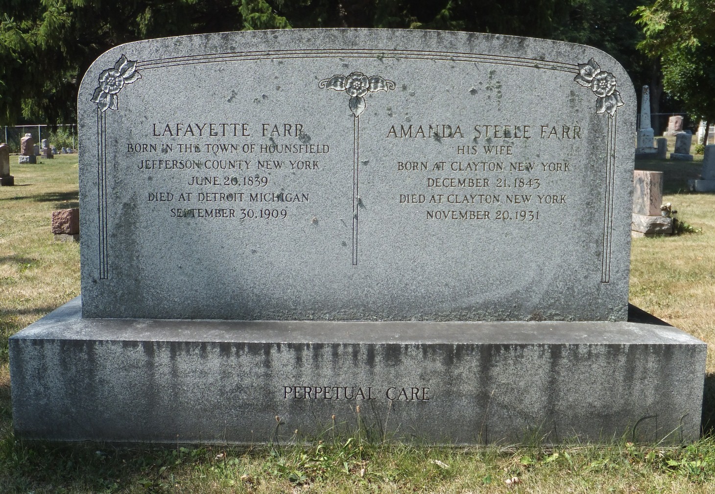 Lafayette FARR [Parents] [scrapbook] 1, 2, 3 was born 1 on 20 Jun 1839 in Clayton, Jefferson, New York, United States. He died 4 on 29 Sep 1909 in Detroit, Wayne, Michigan, United States. Lafayette married Amanda Holt STEELE on 1 Jan 1863 in Jefferson, New York, United States.
