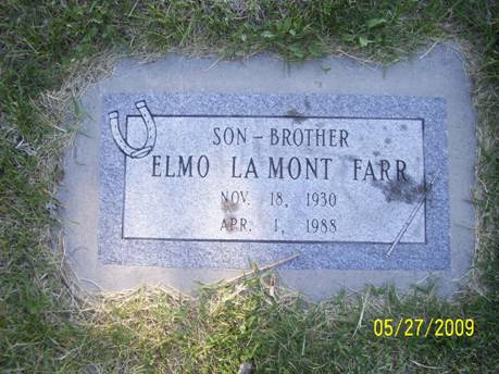 Elmo La Monte FARR [Parents] [scrapbook] 1 was born 2 on 18 Nov 1930 in Ogden, Weber, Utah, United States. He died 3 on 1 Apr 1988 in Boulder City, Clark, Nevada, United States. He was buried on 14 Apr 1988 in Ogden, Weber, Utah, United States. Elmo married Charlene Helen BALDWIN on 9 Jul 1948 in Las Vegas, Clark, Nevada, United States. The marriage ended in divorce. |