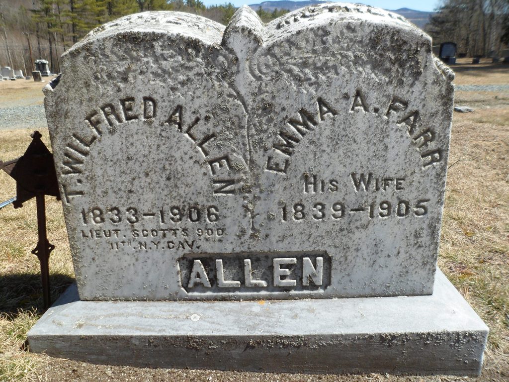 Wilfred Thaddeus ALLEN was born 1 on 7 Apr 1833 in Lysander, Onondaga, New York, United States. He died 1 on 5 Mar 1906 in of Middlebury, Addison, Vermont, United States. Wilfred married Emma A. FARR about 1860 in of West Randolph, Orange, Vermont, United States. |