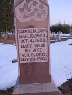 Samuel M. FARR [Parents] [scrapbook] was born 1, 2 on 13 Mar 1834 in Leicester, Addison, Vermont, United States. He died 3 on 4 Oct 1896 in Illinois, United States. Samuel married Mary WEBB on 7 Feb 1860. |