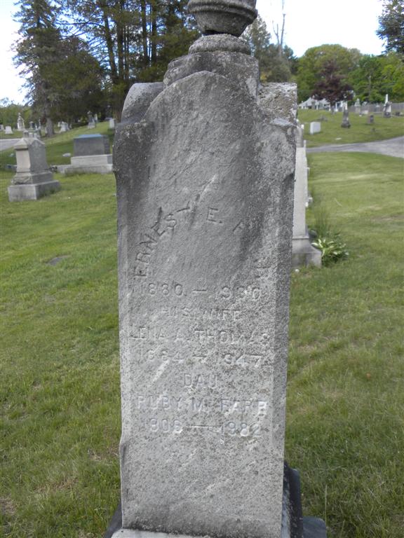 Ernest Eugene FARR [Parents] [scrapbook] was born 1, 2, 3 on 2 Aug 1880 in Athol, Worcester, Massachusetts, United States. He died 4 on 10 Dec 1930 in Athol, Worcester, Massachusetts, United States from of appendicitis. He was buried 5 in Athol, Worcester, Massachusetts, United States. Ernest married 6 Lena Augusta THOMAS on 14 Jun 1905 in Orange, Franklin, Massachusetts, United States. |