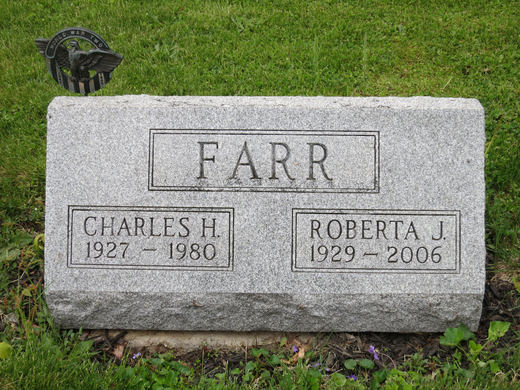 Charles H. FARR [Parents] [scrapbook] was born on 3 Jul 1927 in Wadsworth, Medina, Ohio, United States. He died 1 in Mar 1980 in Medina, Ohio, United States. He was buried in Mar 1980 in Woodlawn Cemetery, Wadsworth, Medina, Ohio, United States. Charles married 2 Roberta Jean SANTEE on 19 Sep 1950 in Stark, Ohio, United States. |
