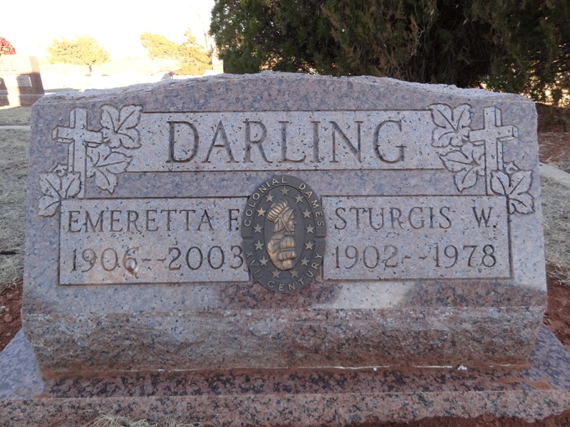 Emeretta Edith FARR [Parents] [scrapbook] was born 1, 2 on 24 May 1906 in Oklahoma, United States. She died 1, 2 on 17 May 2003 in Oklahoma, United States. Emeretta married 3 Sturgis Williams DARLING on 22 Jun 1927 in Shawnee, Pottawatomie, Oklahoma, United States.