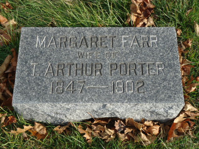 Margaret Jane FARR [Parents] [scrapbook] was born 1, 2 on 12 Apr 1847 in Stanton Heights, Westmoreland, Pennsylvania, United States. She died 1, 2 on 5 Apr 1902 in Waukesha, Waukesha, Wisconsin, United States. Margaret married Theodore Arthur PORTER in 1866 in Pennsylvania, United States. |