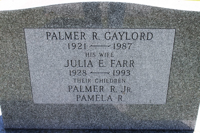 Palmer Rupert GAYLORD was born 1 on 24 Sep 1921 in Waitsfield, Washington, Vermont, United States. He died 2 on 19 Sep 1987 in Waitsfield, Washington, Vermont, United States. He was buried in Waitsfield Common, Washington, Vermont, United States. Palmer married 3 Julia Ellen FARR on 11 Jun 1955 in Waterbury, Washington, Vermont, United States. |