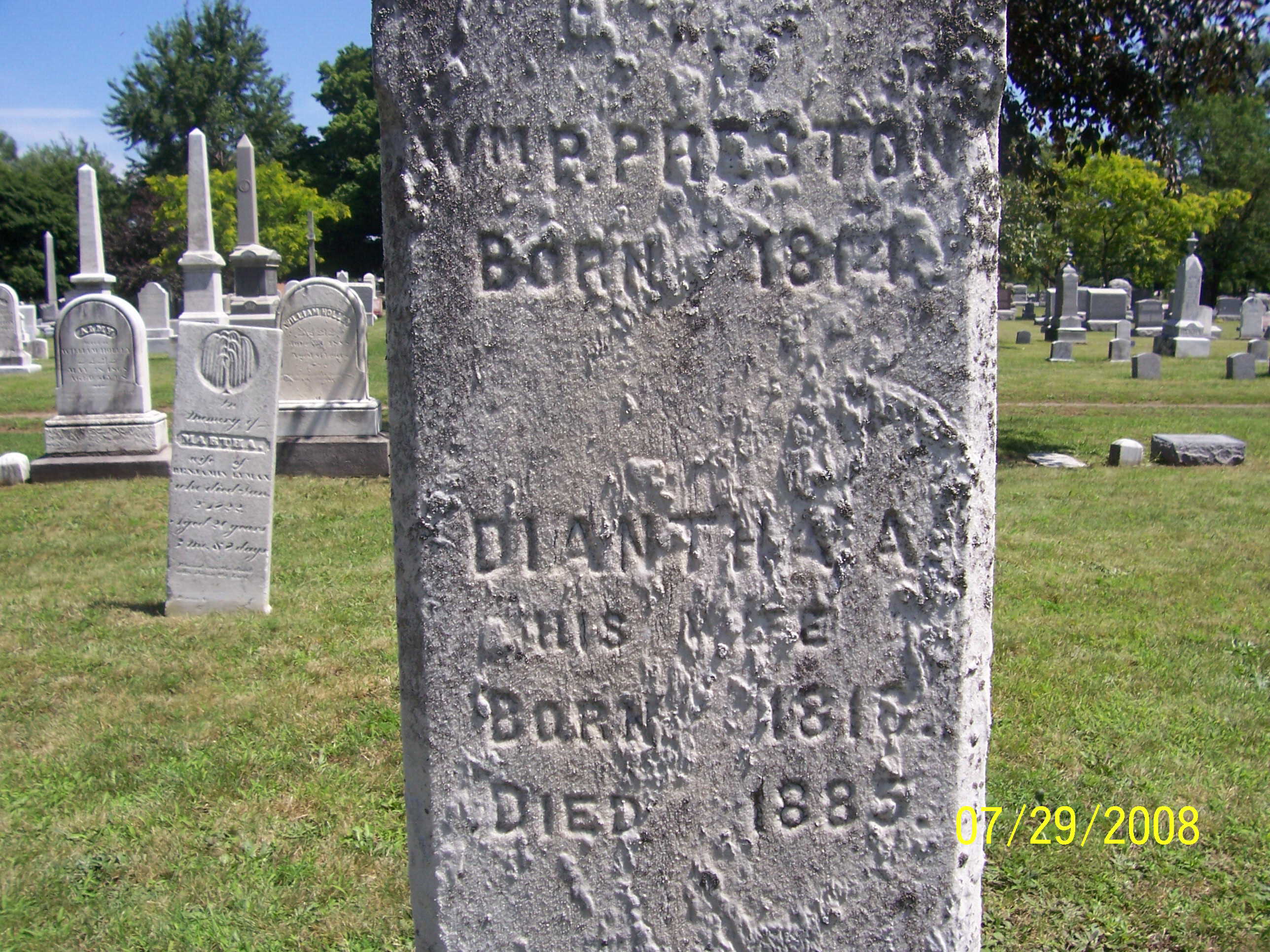 Diantha A. FARR [Parents] [scrapbook] was born in 1818 in Webster, Monroe, New York, United States. She died on 4 Dec 1885 in Webster, Monroe, New York, United States. Diantha married 1 William Plummer PRESTON. |
