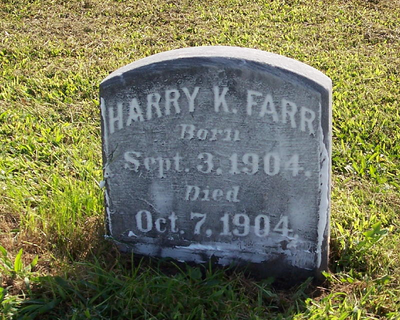 Harry K FARR [scrapbook] was born 1 on 3 Sep 1904 in Jackson Township, Clark, Missouri, United States. He died 1 on 7 Oct 1904 in Jackson Township, Clark, Missouri, United States. He was buried in Saint Patrick, Clark, Missouri, United States.