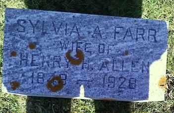 Sylvia A FARR [Parents] [scrapbook] was born 1 on 20 Feb 1848 in Forkston, Wyoming, Pennsylvania, United States. She died 1 on 27 Mar 1928 in Athens, Bradford, Pennsylvania, United States. She was buried 1 in Burlington Township, Bradford, Pennsylvania, United States. Sylvia married Henry Harrison ALLEN on 27 Oct 1870. |