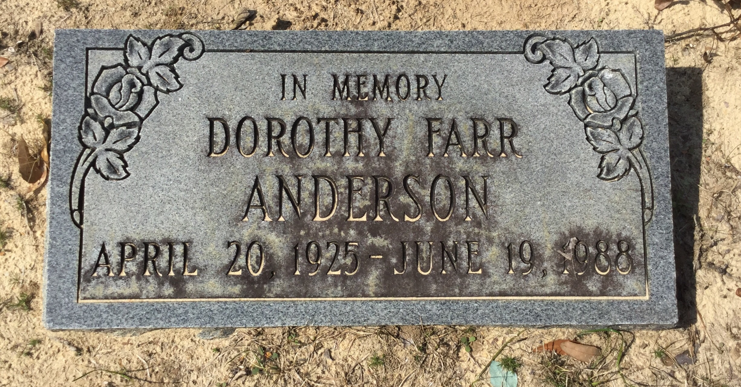 Dorothy Evangeline FARR [Parents] [scrapbook] was born 1, 2, 3 on 20 Apr 1925 in Varnville, Hampton, South Carolina, United States. She died 1, 3 on 19 Jun 1988 in Seaford, York, Virginia, United States. She was buried 1 in Allendale, Allendale, South Carolina, United States. Dorothy married 4 Gerhart ANDERSON on 2 May 1959 in Cumberland, Cumberland, North Carolina, United States. Other marriages:MCDOUGALL, William J. |