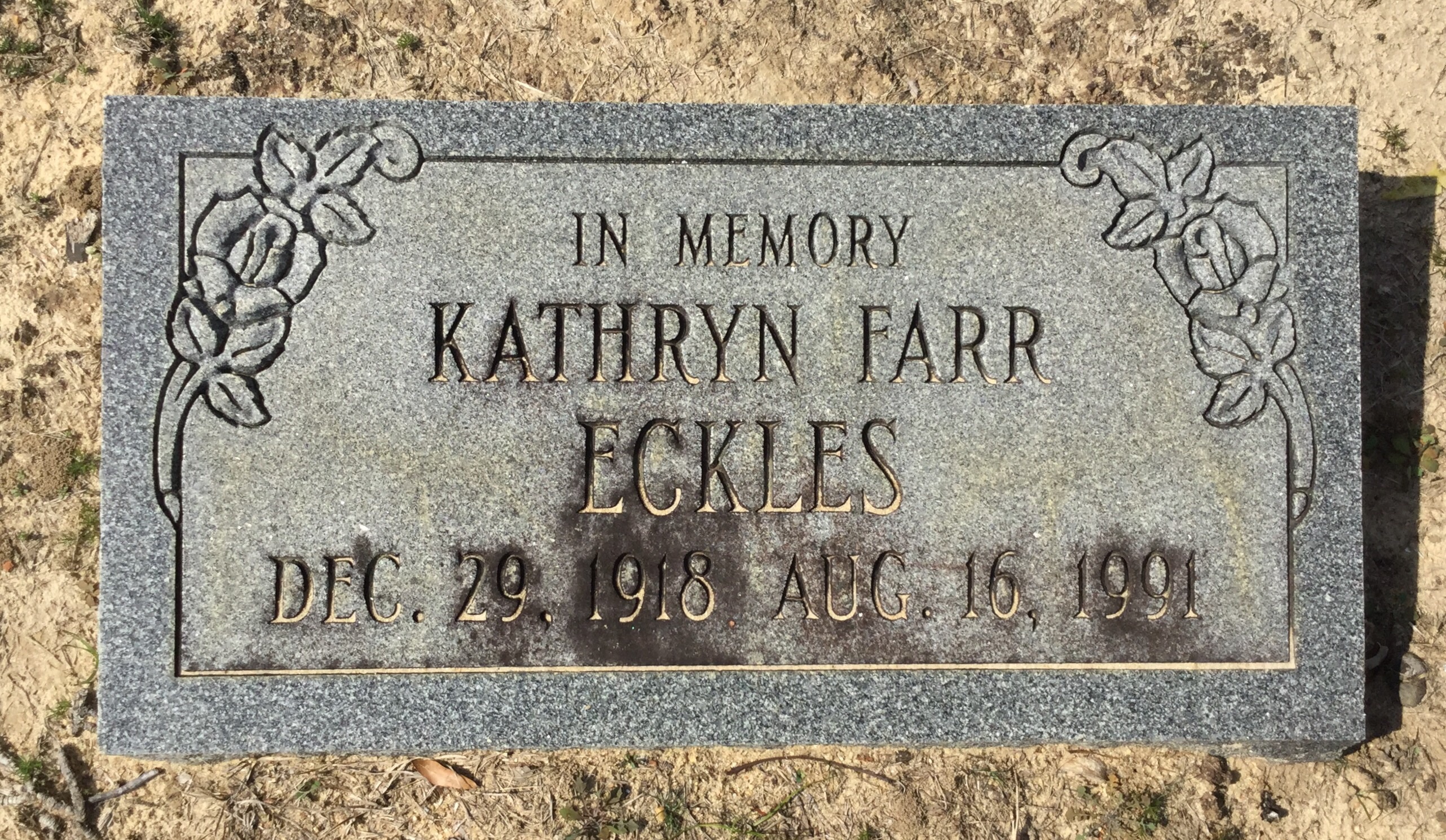 Kathryn Elizabeth FARR [Parents] [scrapbook] was born 1, 2 on 29 Dec 1918 in Orangeburg, South, Carolina, United States. She died 1, 2 on 16 Aug 1991 in Morehead City, Carteret, North Carolina, United States. She was buried 1 in Allendale, Allendale, South Carolina, United States. Kathryn married 3 Ralph R. ECKLES on 11 Jul 1943 in Edgefield, South Carolina, United States. |