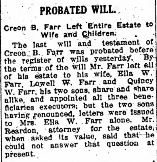 Creon Farr's probate Announcement