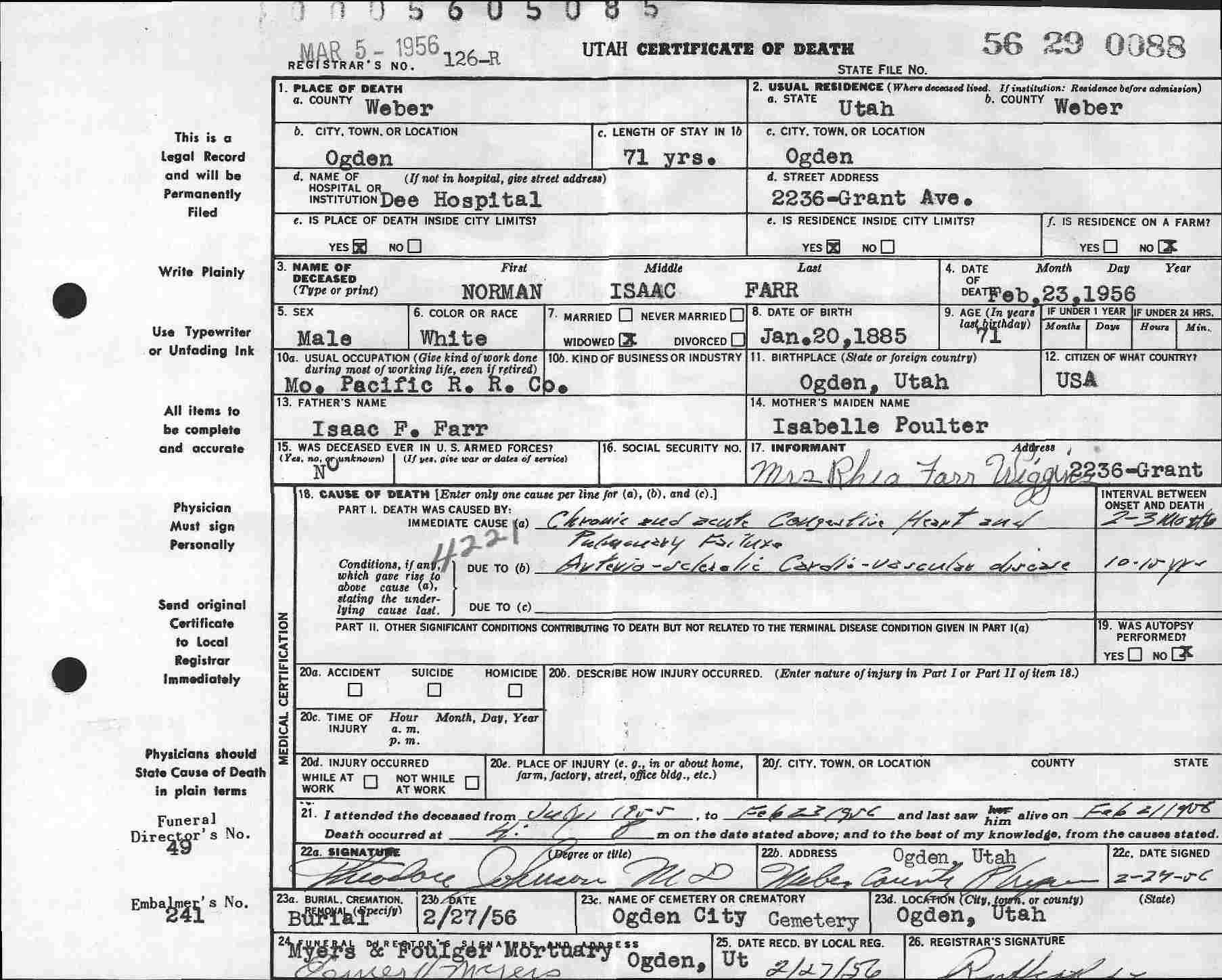 Norman Isaac Farr Death Certificate
