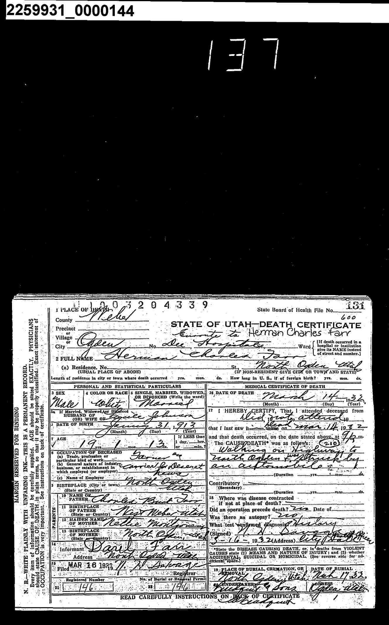 Herman Charles Farr Death Certificate