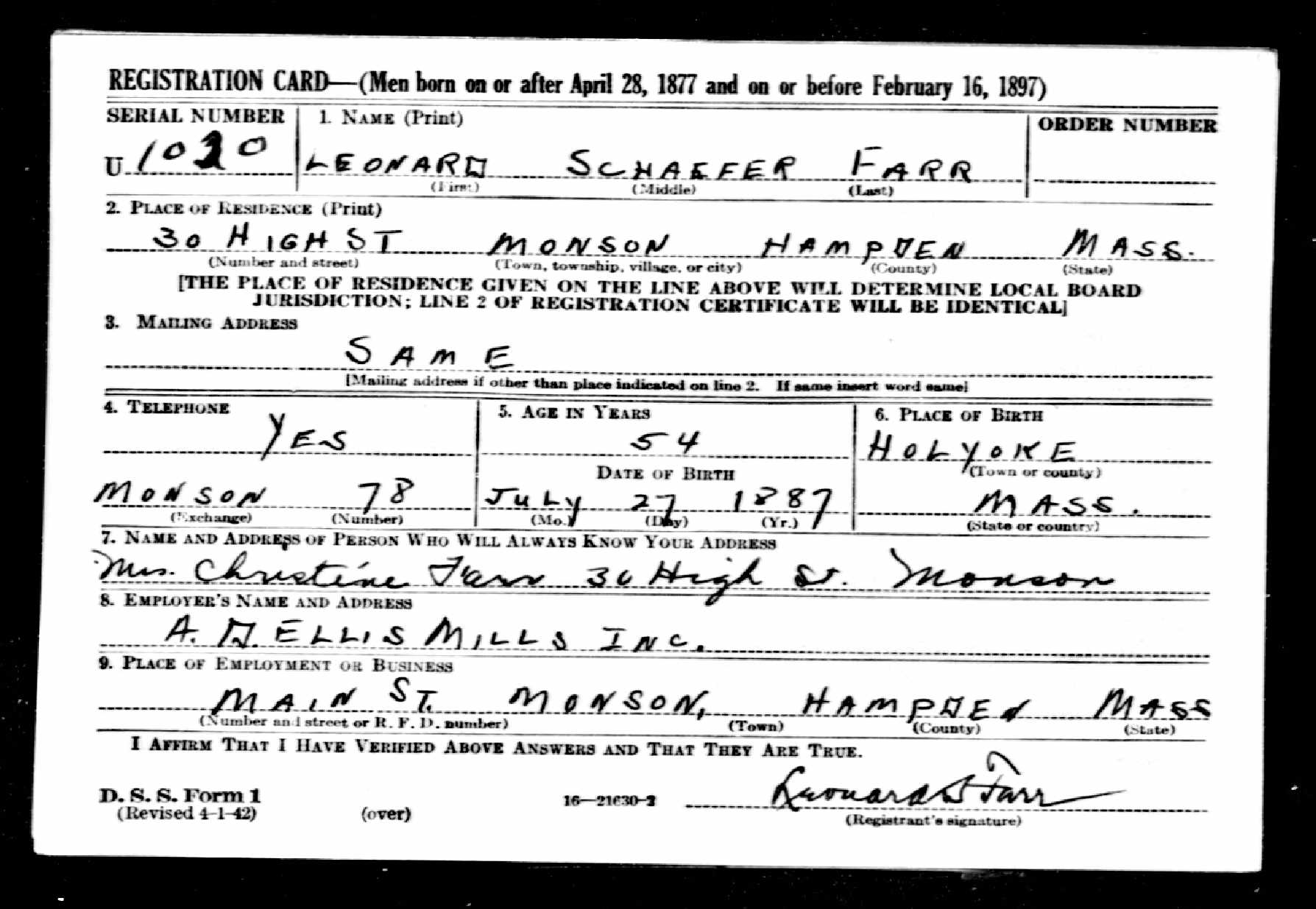 Leonard Schaefer Farr WWII Draft Reg. Card
