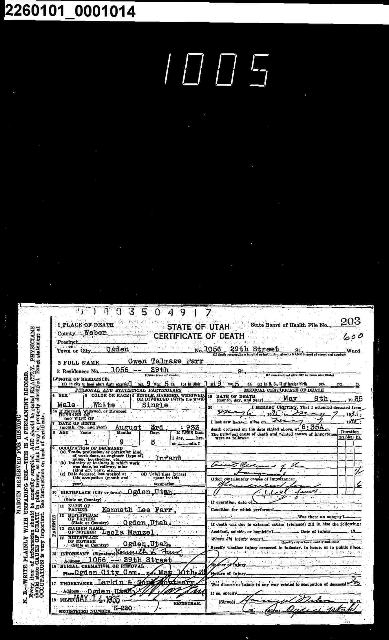 Owen Talmage Farr Death Certificate