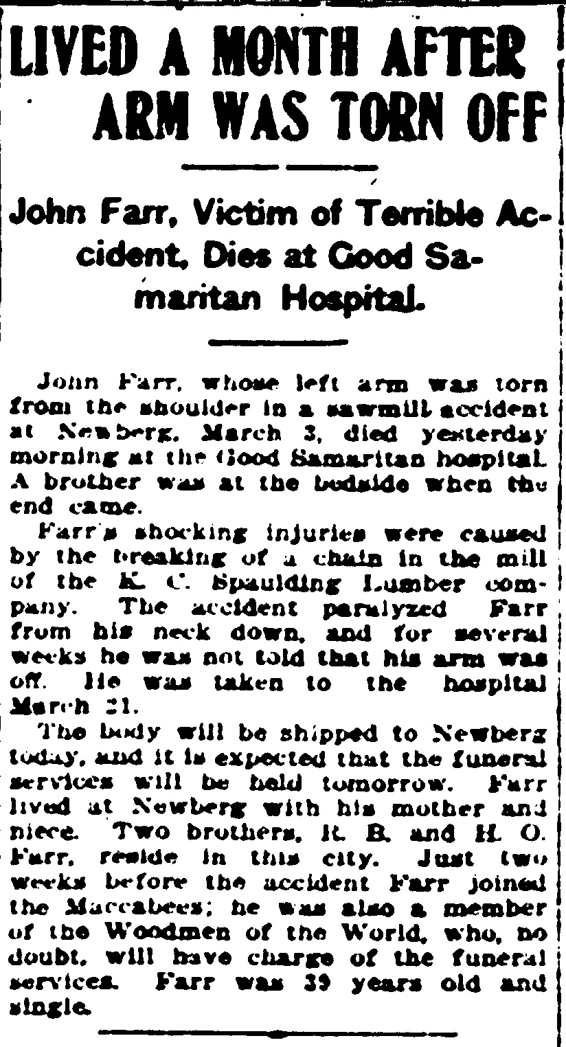 BIRTH 1 Mar 1865 Wyoming County, Pennsylvania, USA DEATH 2 Apr 1905 (aged 40) BURIAL Kilpatrick Post GAR Cemetery Newberg, Yamhill County, Oregon, USA PLOT GAR, Block 70, Grave 3. MEMORIAL ID 8716782