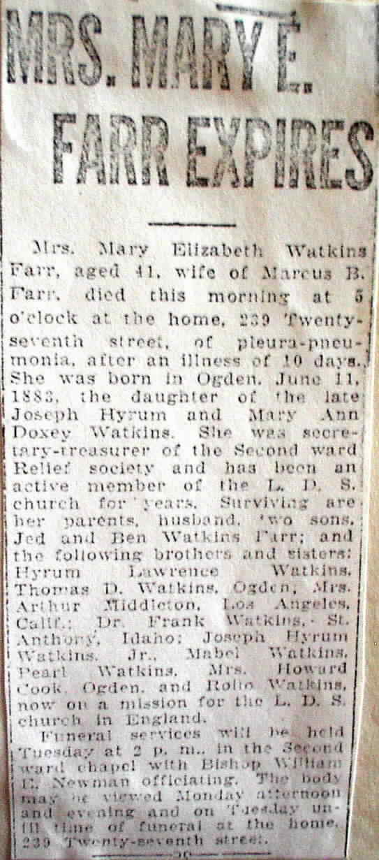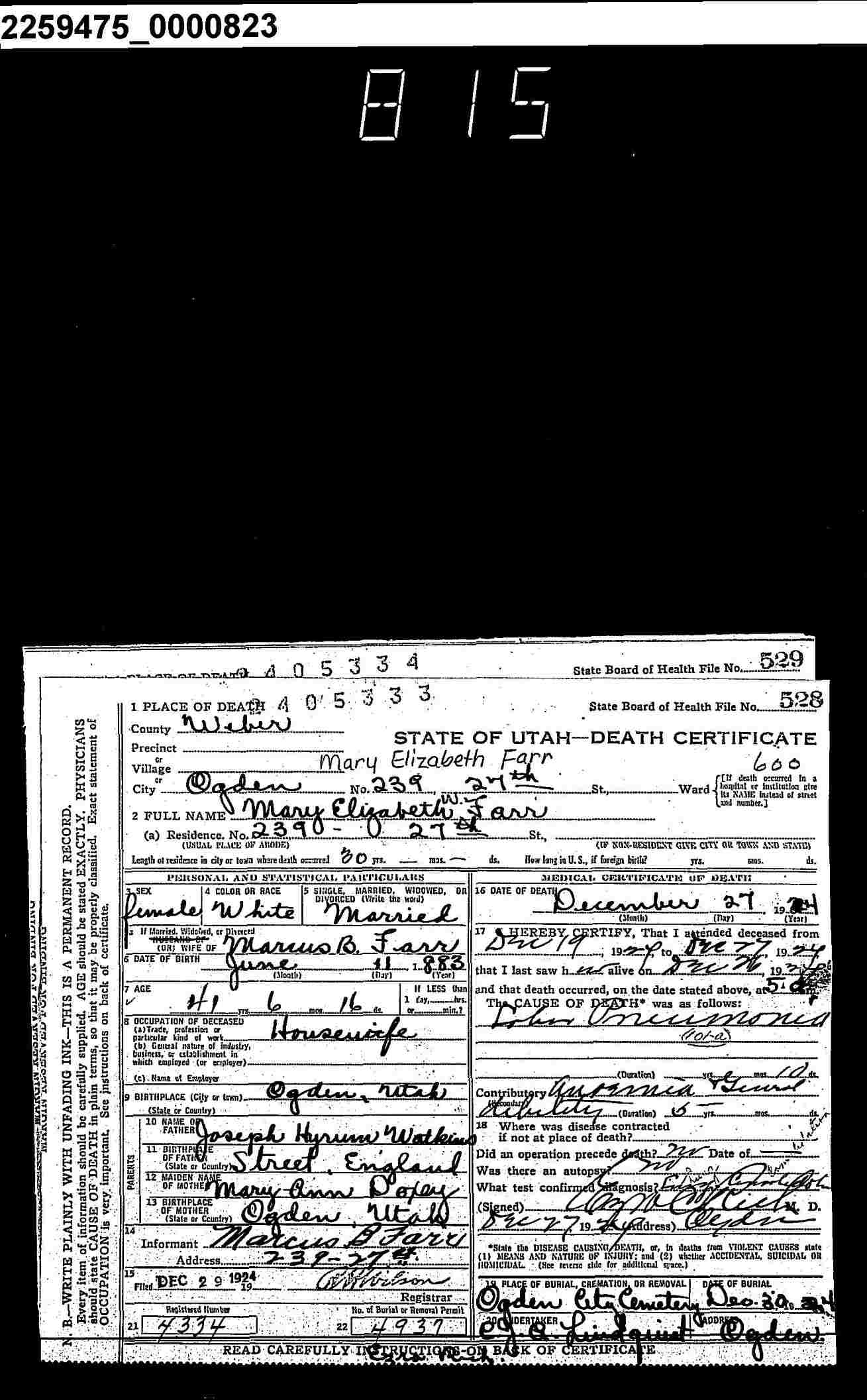 | Mary Elizabeth Watkins Farr Death Certificate |